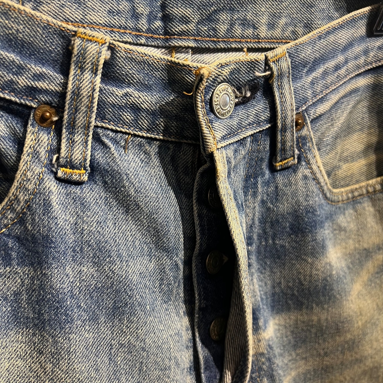 全体的に色落ちやダメージ・汚れが入っており、雰囲気良く仕上がった味のある一本です。