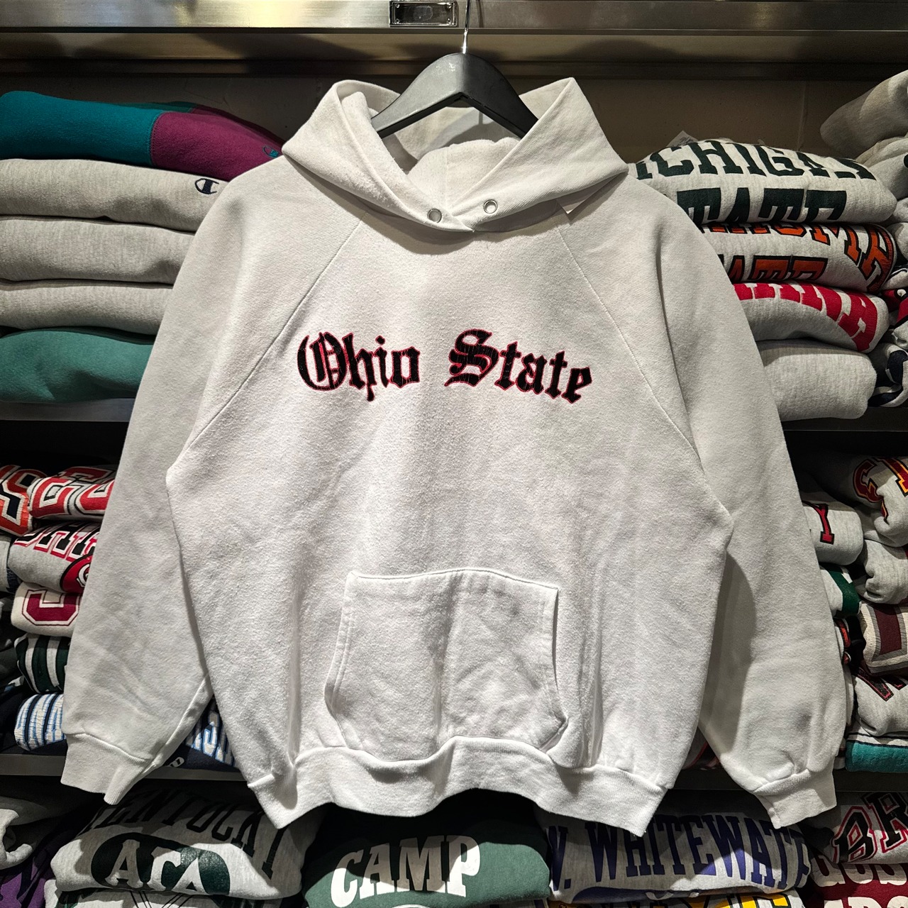 OHIO STATEはいわゆるリバースウィーブでも人気ですが、同様のオールドイングリッシュデザインが魅力的です。リバースだとちょこちょこ入荷してきますが逆にこっちのチャンピオンボディの方が見つからないレアピースです。