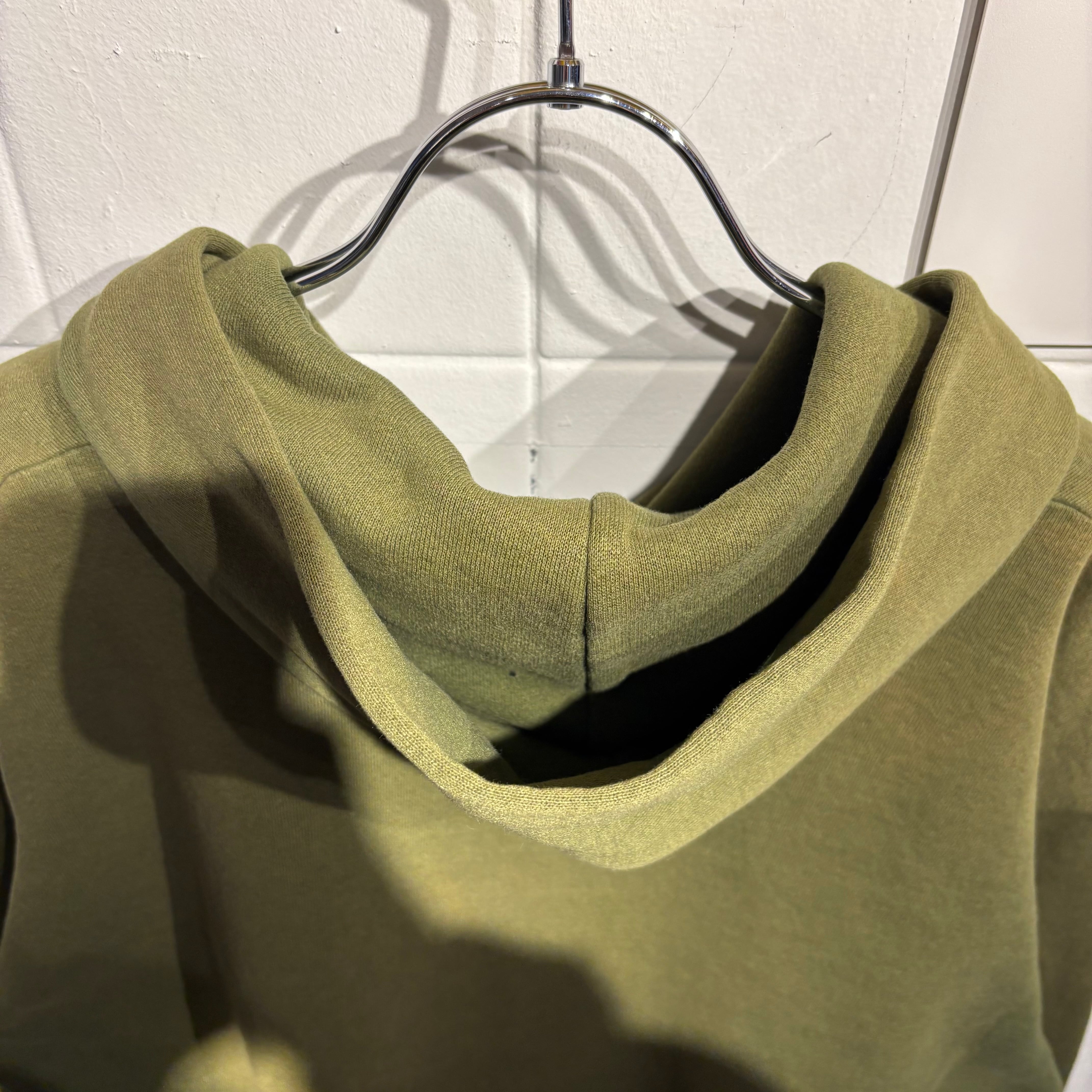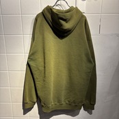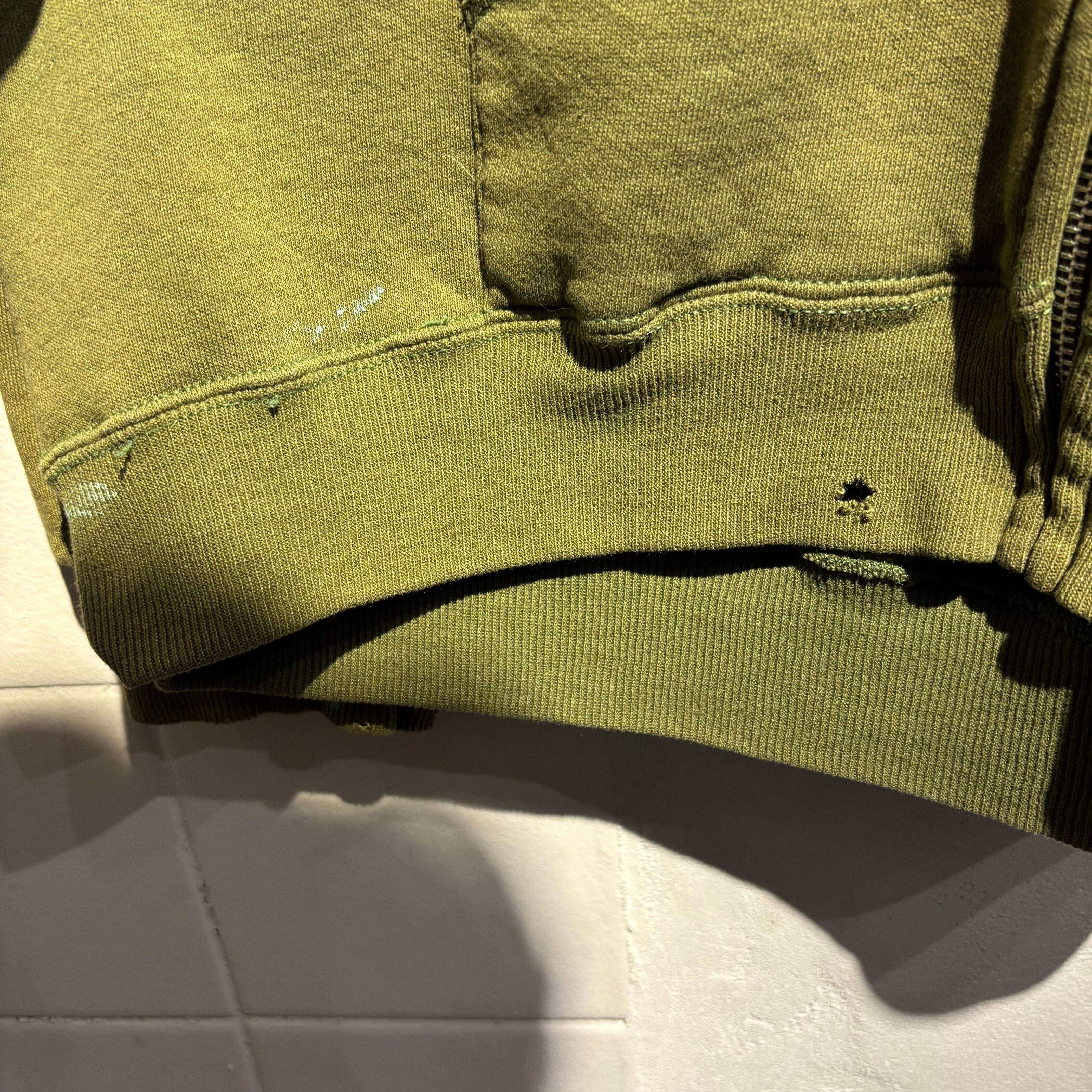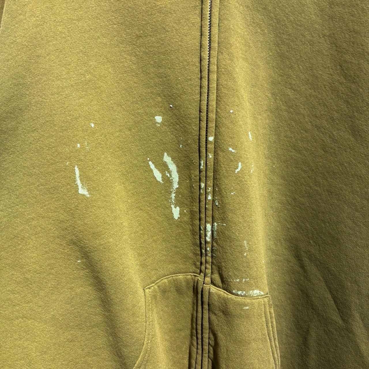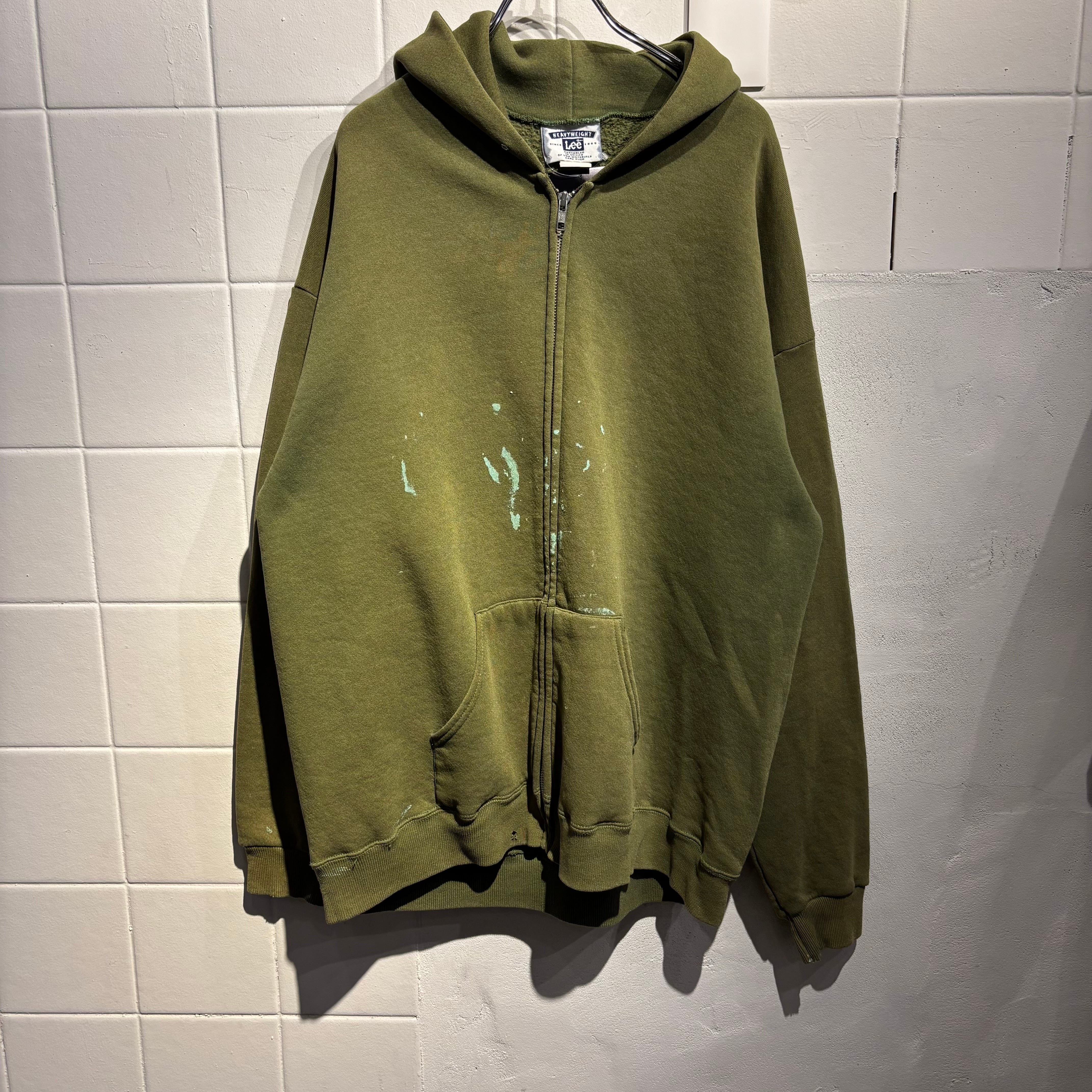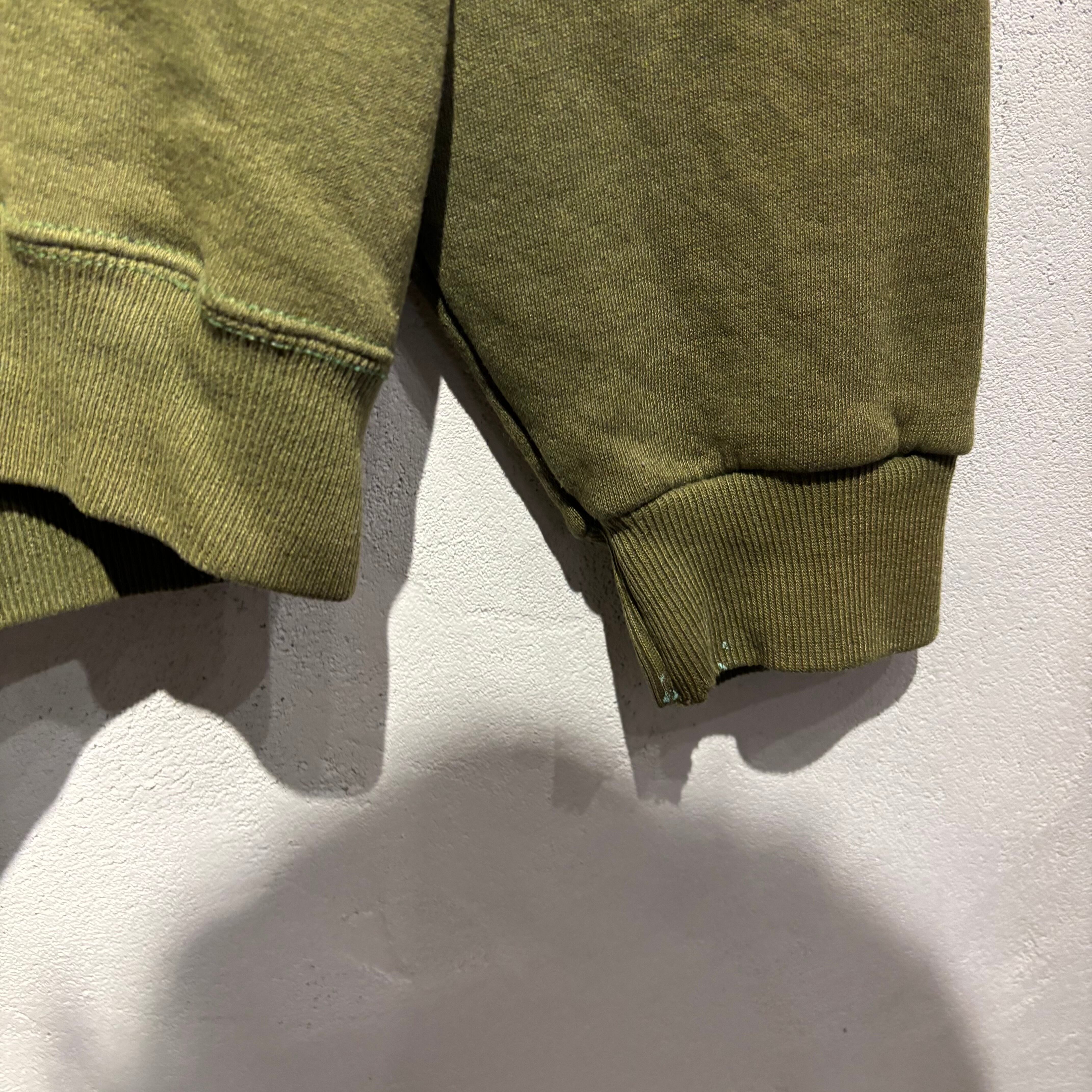 ミリタリーのようなカーキボディの無地パーカーですが、フロントや袖先に飛び散ったティファニーブルーのペンキが最高に良い1着です。