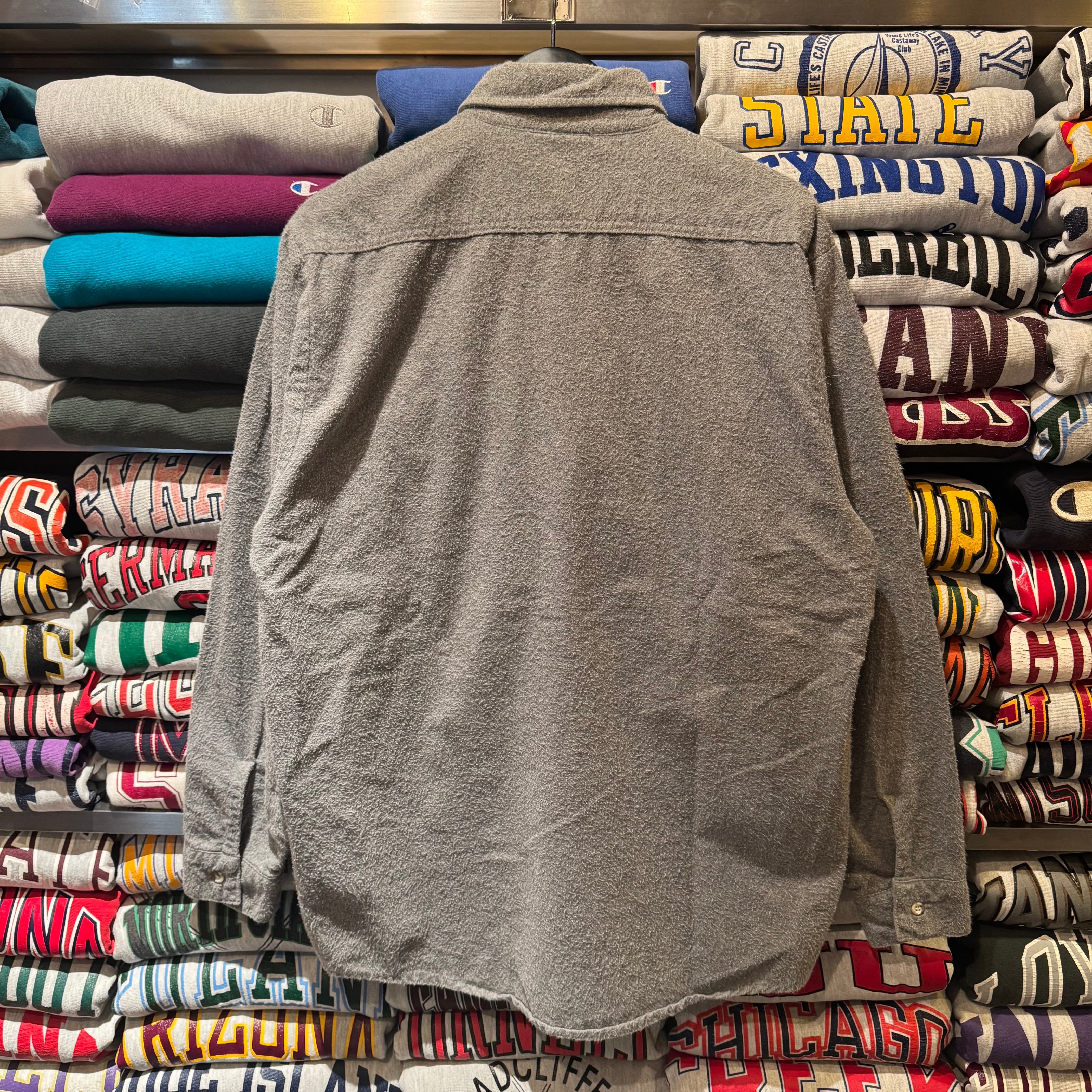 グレー単色のいたってシンプルな1着。ネル=チェックのイメージが強いですが、チェック苦手な方に是非オススメしたいシャツです。