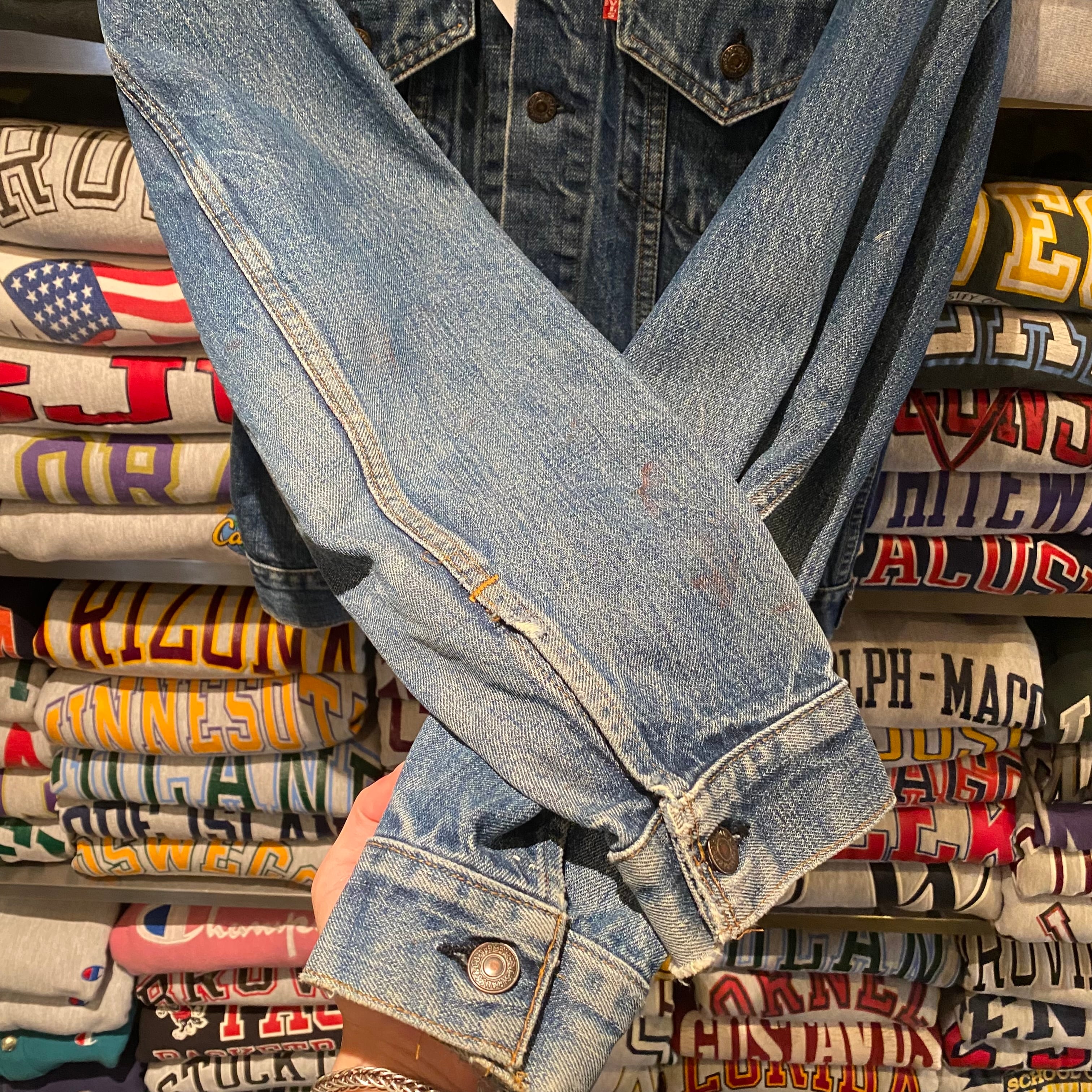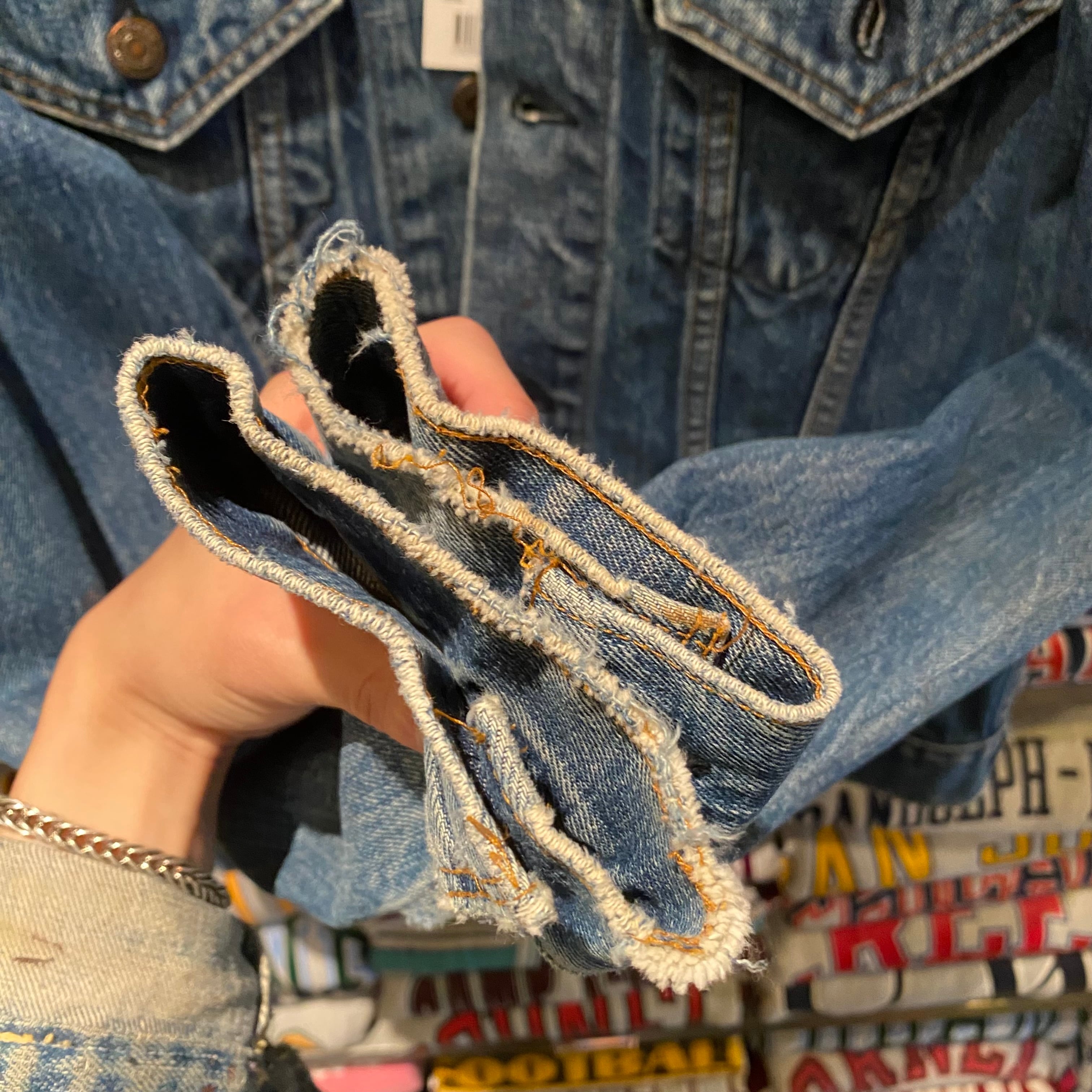 色残りは5割程度と言ったところで、ペンキ飛びや袖先のスレ、ダメージなど良い雰囲気の1着ですね。